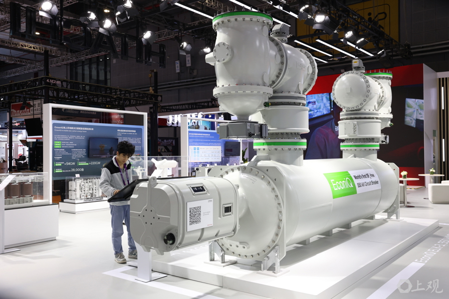 日立集团在进博会上多次展示了全球首创技术及产品,涉及绿色能源、智能制造等领域。这是日立能源本次展示的“大杀器”——全球首台550kV无SF₆气体绝缘开关设备,该设备采用全固态绝缘技术,实现了更安全、更环保的电力传输方案,适用于特高压输电场景。