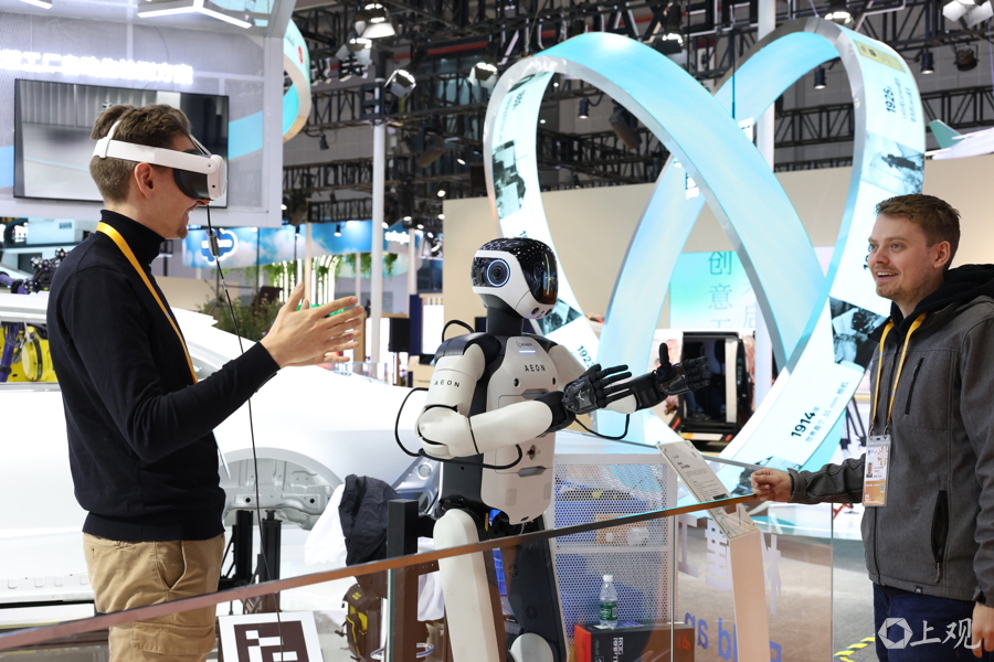 工业巨头海克斯康(Hexagon)展示多项创新技术及产品,涵盖智能制造、智慧城市等领域。其为智能制造研发的人形机器人工业场景AEON,在本届进博会上全球首发。这是工程师展示其可通过VR操控的交互演示。