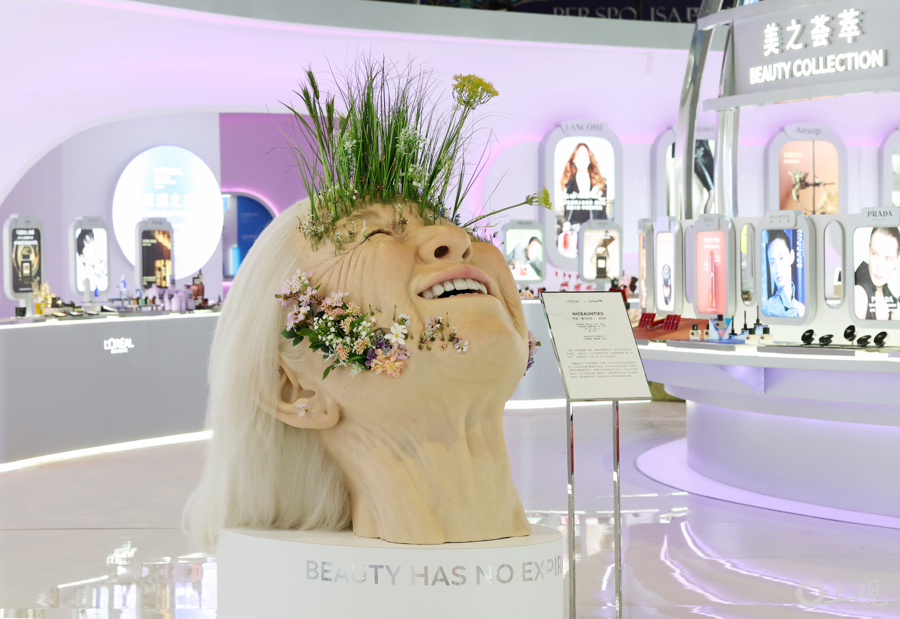 这是欧莱雅展出的艺术装置《阿姨·春日肌肤》,以充满夸张和想象的手法,探索长寿与护肤的相得益彰。今年欧莱雅以三馆联动亮相消费品展区、法国馆与创新孵化专区,是单体面积最大的日化行业参展企业。